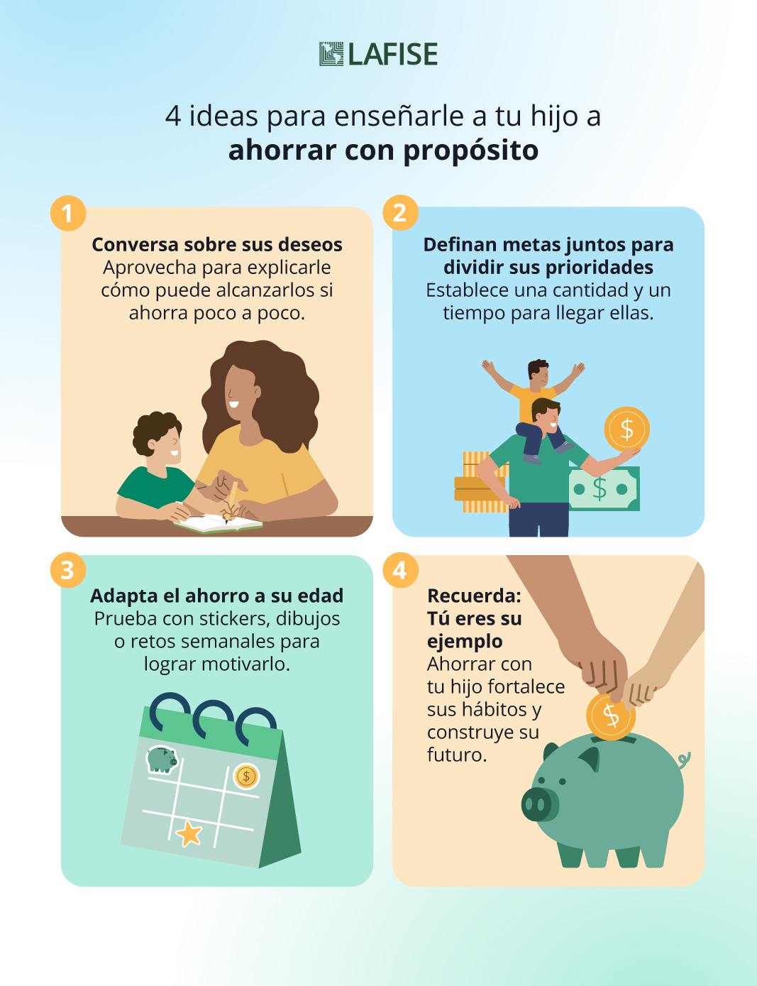 Desde que tu hijo te comparte sus deseos, estás ante una oportunidad para introducirlo al hábito del ahorro y hacer de su proceso algo creativo y fácil para que pueda familiarizarse con conceptos básicos financieros y enseñarles valores como la previsión y la responsabilidad.