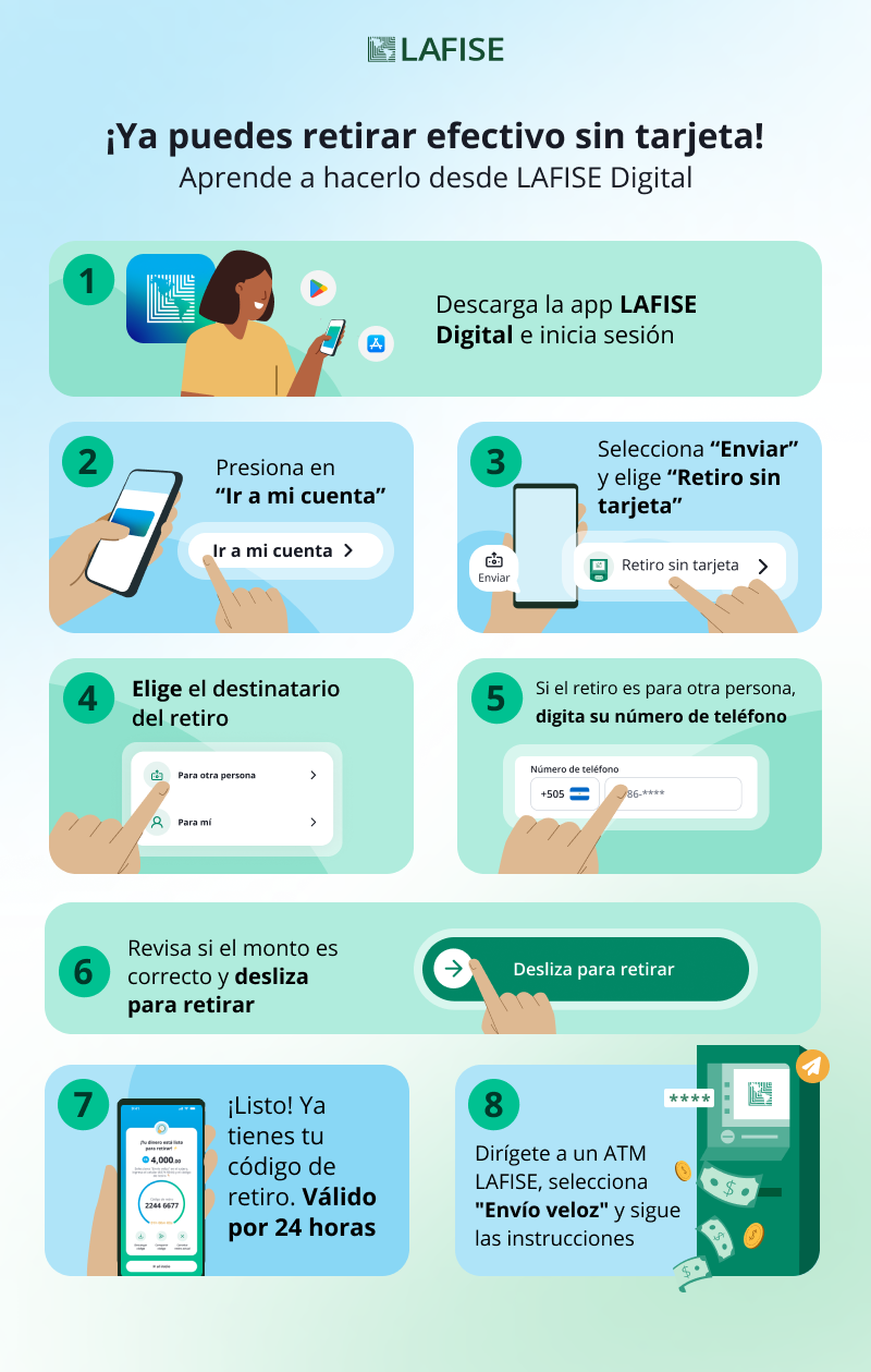 Esta transacción está disponible para que retires hasta dos veces por día, con un límite de C$15,000 córdobas o US$500 dólares, por cada retiro sin tarjeta. Recuerda que el código de retiro es válido durante 24 horas, a partir del momento en que lo creaste y puedes retirar tu efectivo en el ATM LAFISE más cercano.