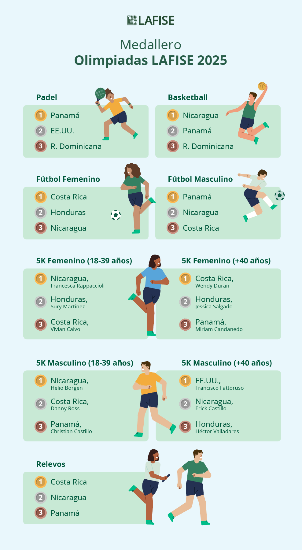 El evento también representó una valiosa oportunidad para fortalecer la conexión entre países, fomentar la vida saludable y reconocer el esfuerzo de cada colaborador de Grupo LAFISE. Fue una experiencia que logró entusiasmar a decenas de atletas y demostrar el trabajo en equipo y el espíritu deportivo.