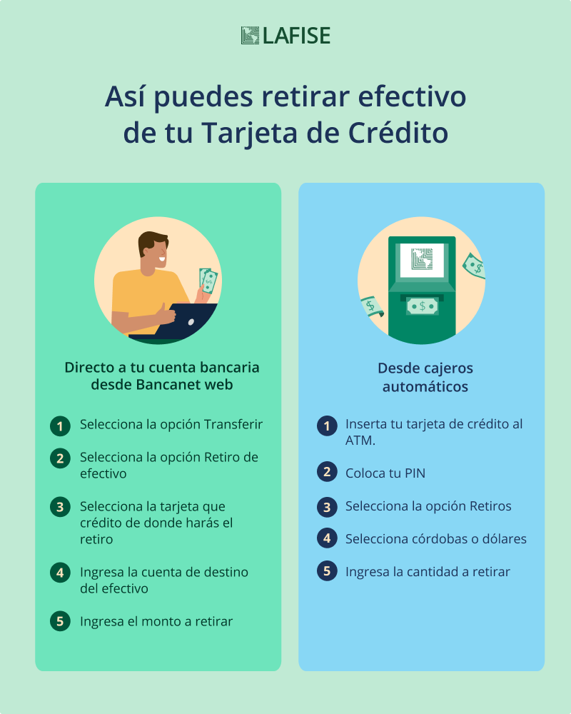 Lo mejor del retiro de efectivo con Tarjeta de Crédito de LAFISE es que se adapta a tus necesidades. Tienes la posibilidad de obtener dinero al instante, con la tranquilidad de que puedes organizar tu pago en el siguiente corte, y lo mejor es que existen varias maneras de acceder a este beneficio, según lo que sea más cómodo para ti.